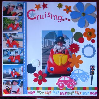 The stamped images are from one of my favourite Stampin Up sets - Priceless. I'm also getting used to using the very wonderful and convenient Simply Scrappin' Kits and found the "Crew Kids Boy" set coordinated very well with my choice of background colours. The self adhesive shapes from these kits make scrapping quick and easy, and the coordinating papers are great to adhere to chipboard shapes.