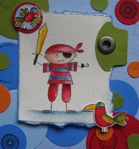 This stamping technique is adaptable - you can create flat areas of colour or you can create depth through shading. I've used both techniques here. The birds are quite flat but the "Little Pirate" has some shading on his face, shirt and pants.