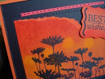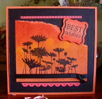 This card uses Black Stazon Ink for the daisy image. I created the background first, and it was fun using a number of different stamping tools to achieve the variation in colour.