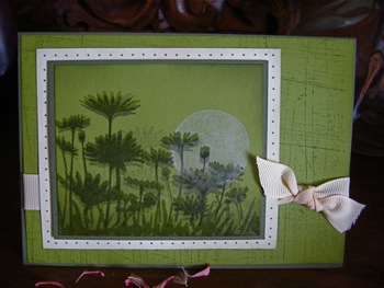When you first look at this card you may think your eyes have gone out of focus. That actually is a technique I've used to try to create movement. It involves Stamping Off which is where the stamp is inked up and stamped on the card, then re-stamped (without re-inking) slightly off the original image. You'll achieve two tones of the one colour, and instantly create depth in your work. Because I wanted to add the moon rise, I clear embossed the images, punched a circle into some computer paper to create a mask, then sponged with Craft White over the top.
